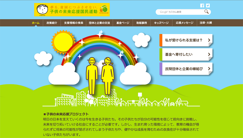 内閣府や文部科学省、厚生労働省とともに、子どもの貧困対策推進に取り組む日本財団では、平成27年10月より「子供の未来応援基金」を設置。貧困状態にある子どもの支援活動に草の根で取り組むNPOを支援して、社会全体で子どもの貧困対策を進める環境を整備したり、地域に子どもの居場所となる拠点を設け、子どもたちに生きる力を育むプログラムを提供しています。私共もその思いに賛同し、今回少額ながら寄付をさせていただきました。明日の日本を支えていく子どもたちのために、企業として「子供の未来応援プロジェクト」を応援します。